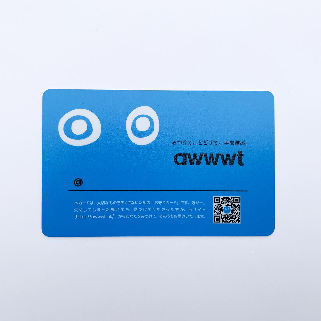 本カードは、大切なものを失くさないための「お守りカード」です。万が一、失くしてしまった場合でも、見つけてくださった方が、当サイト(https://awwwt.ink/) からあなたをみつけて、そのうちお届けいたします。